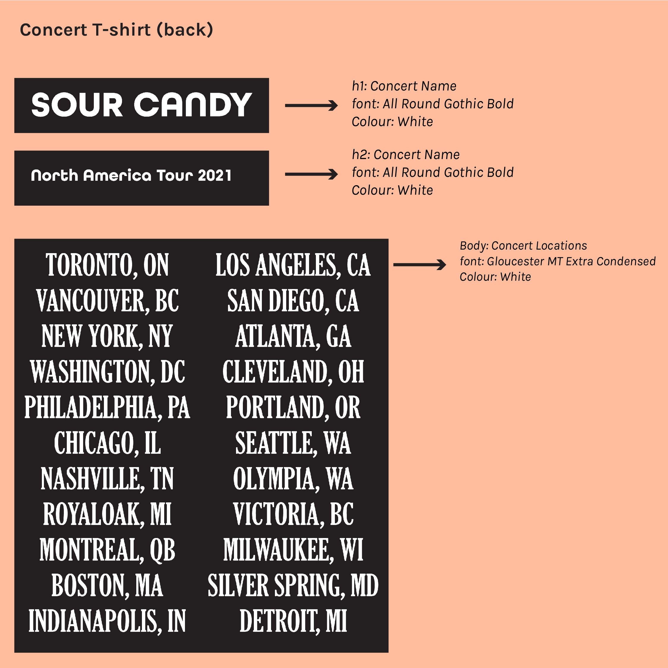 Finally, for the concert t-shirt, I opted for a minimalist design that listed down various states and provinces in North America where the artist had a significant following. The use of mockups allowed me to refine my designs and produce high-quality products that were both aesthetically pleasing and effective in promoting the artist and the event.